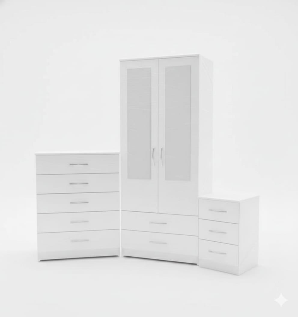 *This stylish bedroom furniture set includes a sleek 2-door wardrobe with mirror panels and two matching chest of drawers. The walnut finish gives a warm, modern look with silver handle accents. The wardrobe features:*